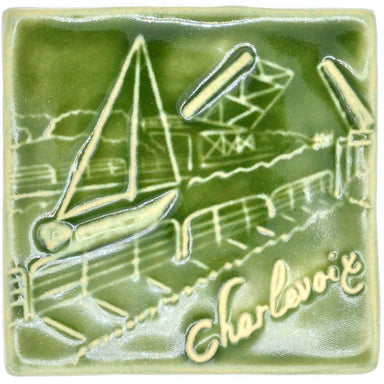 4x4 Charlevoix commemorative tile is a smaller version of our 6x6 tile. Featuring a sailboat going under the drawbridge.