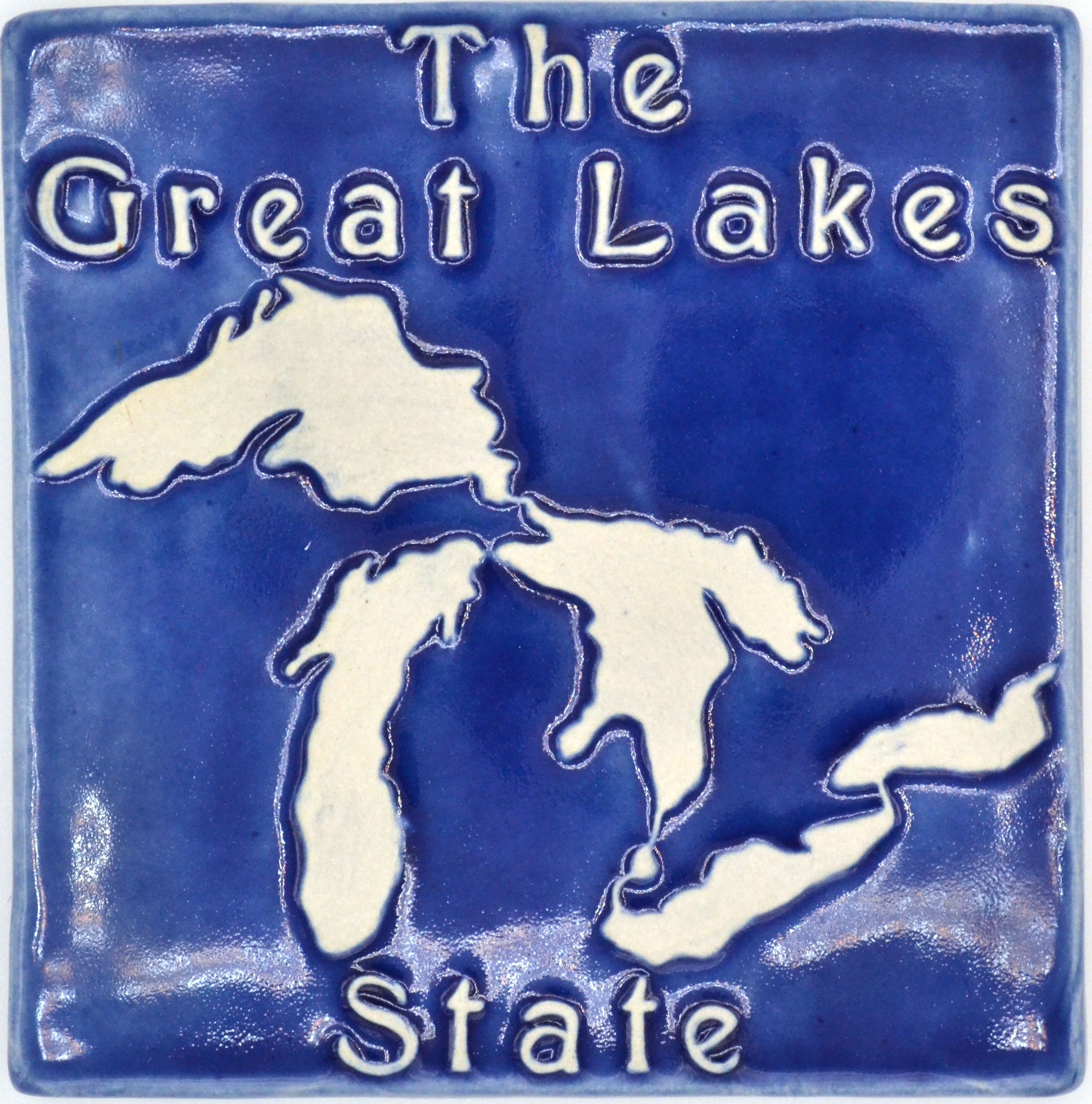 One of our best selling tiles, the 6x6 Great Lakes State tile is a hand carving of Michigan and it's adjoining Great Lakes. Treated with a buffed glaze application to bring out the natural colors in the underlying clay.