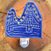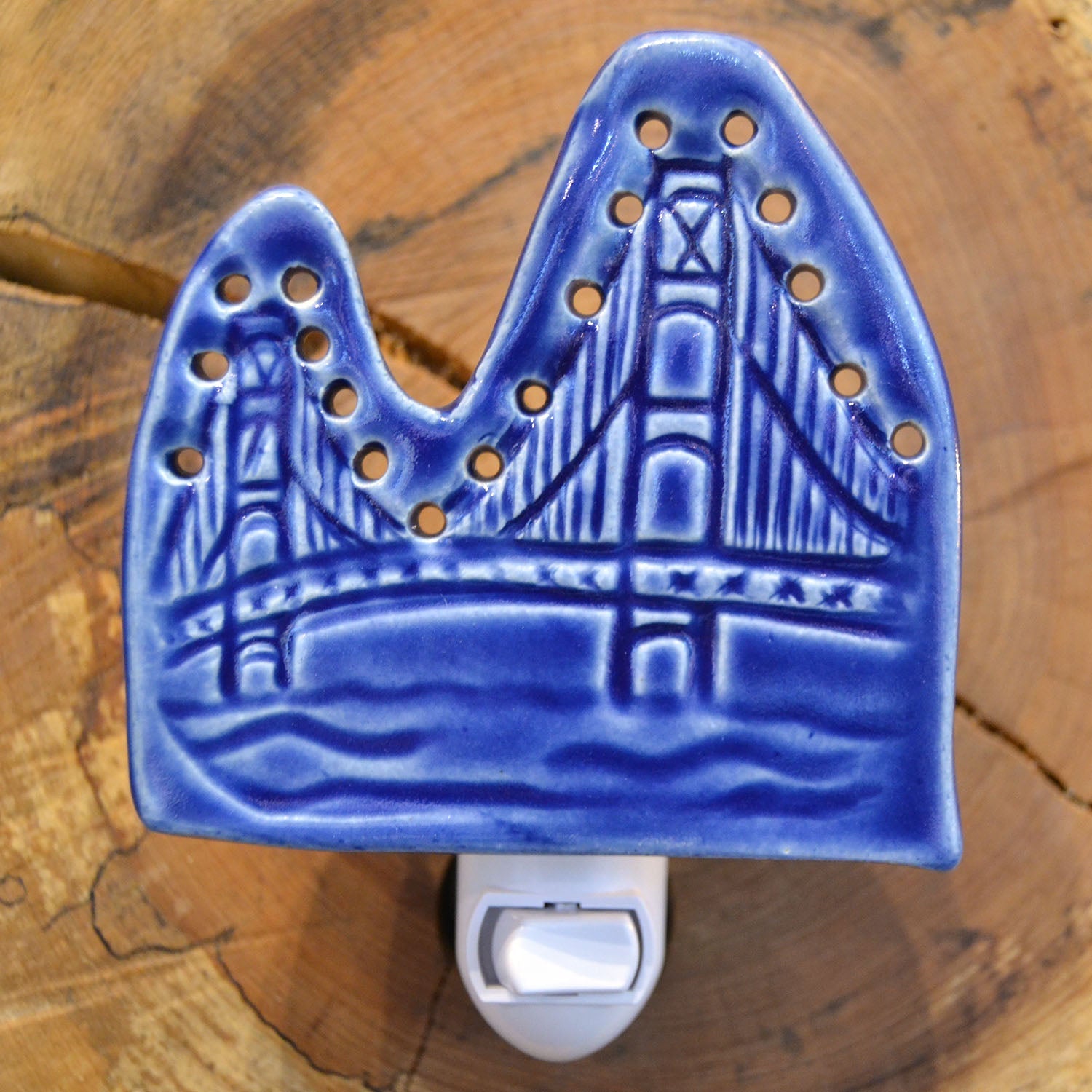 These nightlights are made using stamps that we are creating from our original designs. This one features our Mackinac Bridge tile design with holes punched in where the lights are on the bridge at night.